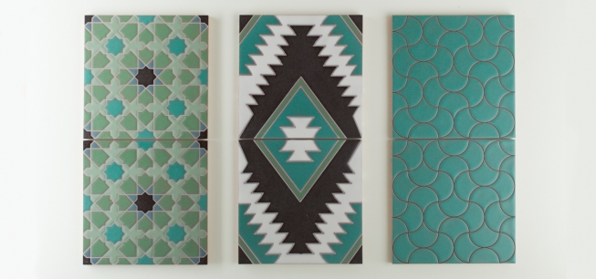These new designs come in a variety of richly saturated hues ranging from cool grays to vibrant turquoise, ripe red and lustrous black. Try pairing them with a solid offset field tile such as Feldspar Gloss, Pine Grove, Silver Lilac, and Carbon.