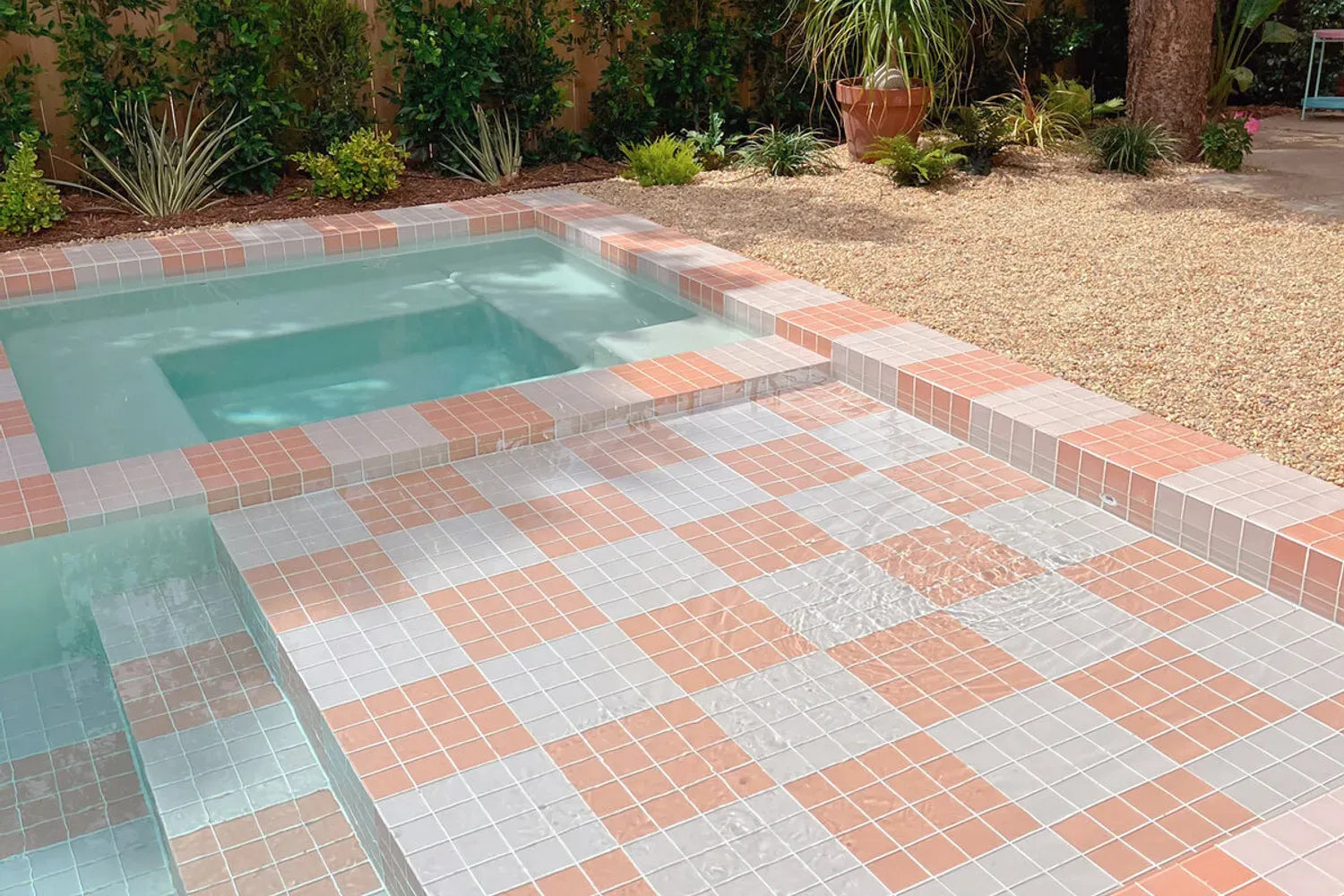 Samantha Klein designed an unforgettable backyard oasis with two shades of pink tile. A checkered combination of 3x3 Mosaic Tile in Carolina Wren Matte and Rosy Finch Matte along the pool border, sun shelf, stairs, and integrated spa create a fun and lively environment that begs you to dive right in.